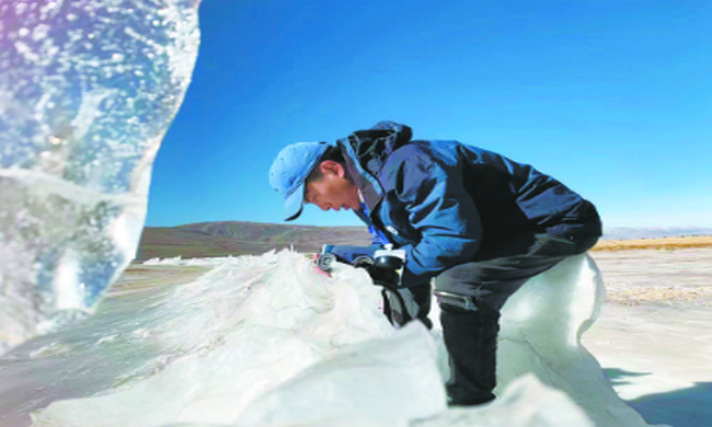 來到隆寶湖邊,才仁旦周拿起望遠(yuǎn)鏡開始“看景”,一番掃視后,突然定在原地,嘴里數(shù)著1、2、3……然后從口袋里拿出筆記本,趴在一塊晶瑩剔透的冰塊上記錄起來。
