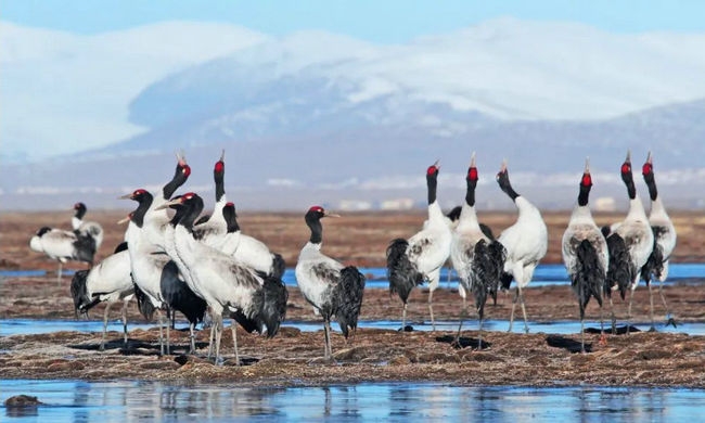 保護區(qū)內(nèi)主要植被類型為草甸和淡水沼澤,為水禽候鳥提供了充足的食物和良好的生態(tài)環(huán)境,成為黑頸鶴棲息繁殖的集中地區(qū),每年有數(shù)百只黑頸鶴在保護區(qū)內(nèi)筑巢繁殖。每年4月,牧草剛剛返青,黑頸鶴從南方到達這里,生兒育女,避暑度假,待到牧草枯黃的10月上旬,它們攜兒帶女飛往南部越冬,被我國鳥類專家譽為“黑頸鶴之鄉(xiāng)”。