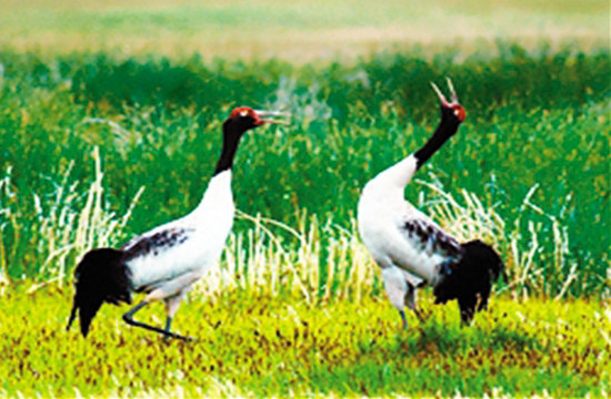 獨(dú)特的地理環(huán)境使隆寶成為世界珍禽黑頸鶴的故鄉(xiāng),是我國(guó)黑頸鶴繁殖和生存最集中的地方之一。黑頸鶴在青藏高原及其鄰近地區(qū)海拔3500~4500米的高原沼澤繁殖,在青藏高原南部和云貴高原2500~3500米的高原或山區(qū)越冬,是典型的候鳥(niǎo)。每年的3月中旬,玉樹(shù)草原依然是一片枯黃色,草原、沼澤冰雪覆蓋,河流冰封,大地在沉睡。而這時(shí),歸心似箭的仙鶴們從云南省中甸和貴州省咸寧的草海等地結(jié)隊(duì)排成“一”字或大寫(xiě)的“人”字形出發(fā)。雖然空中飄著雪花,刮著寒風(fēng),仙鳥(niǎo)們卻一路歡快地高歌著,迎著寒風(fēng)長(zhǎng)途跋涉,飛向故鄉(xiāng)青海高原,來(lái)到海拔四五千米高的湖泊、河流、沼澤和草甸地,群集覓食、戀愛(ài)和生兒育女。其中聚集最多的就是隆寶。