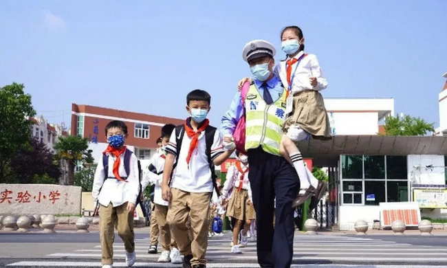 侍東亮小跑著張開雙臂,“護(hù)小雞式”護(hù)送孩子過斑馬線