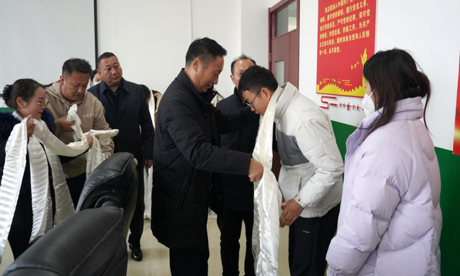 會后,扎西旺加市長一行為學(xué)校領(lǐng)導(dǎo)和我市異地辦班教師敬獻(xiàn)哈達(dá),為學(xué)生發(fā)放了慰問品。
