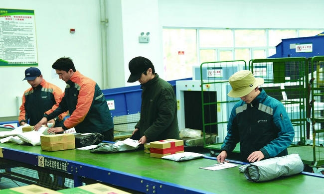 物流園內(nèi)忙碌的快遞員。程宦寧 余暉 攝